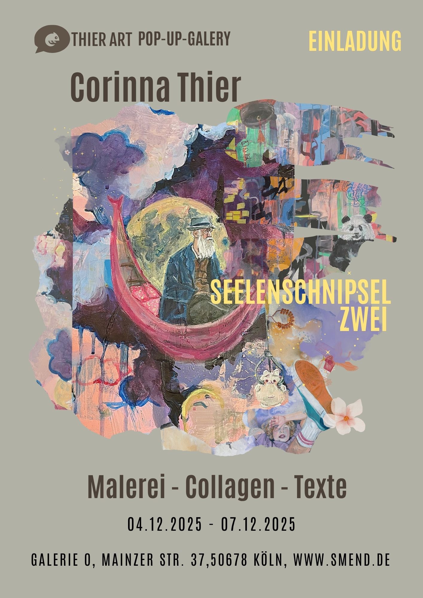 04. – 07. Dezember 2025, Galerie O, KölnDie Künstlerin und Psychologin Corinna Thier lädt mit ihrer Ausstellung „Seelenschnipsel Zwei“ zu einer Entdeckungsreise durch farbige Seelenlandschaften ein. In ihren Malereien, Collagen und Druckgrafiken verweben sich Erinnerungen, Alltagsfunde, Gedanken und Wortfragmente zu neuen Bildwelten.